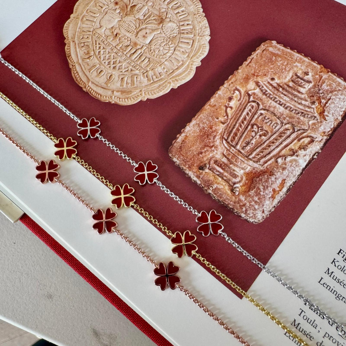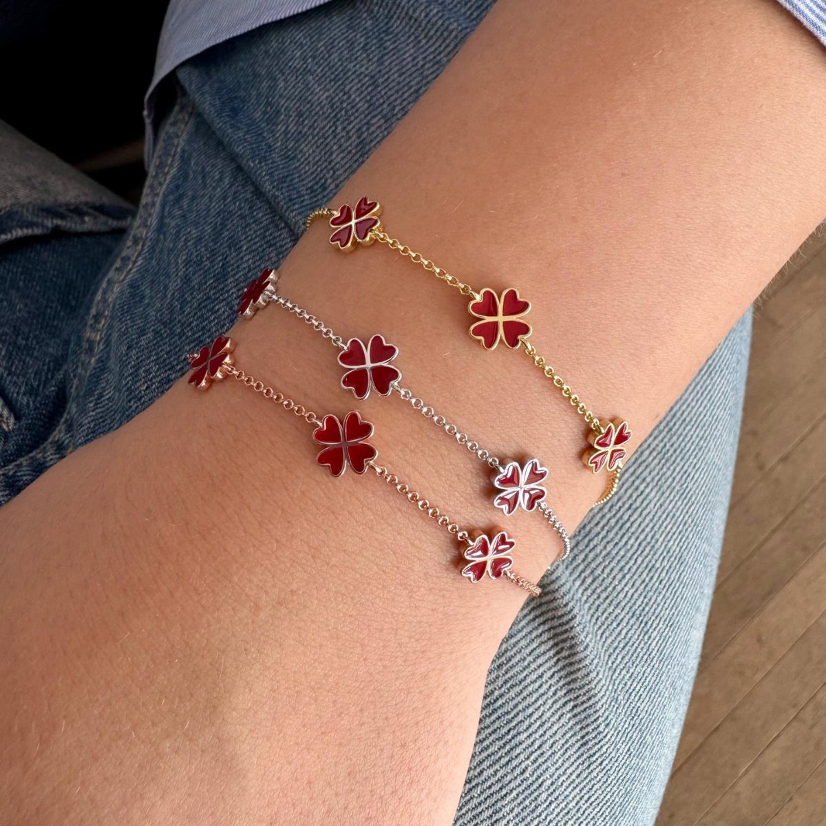 צמיד תלתן אדום עשוי כסף טהור, מגיע גם בציפוי רוז גולד וזהב צהוב