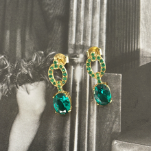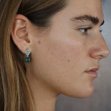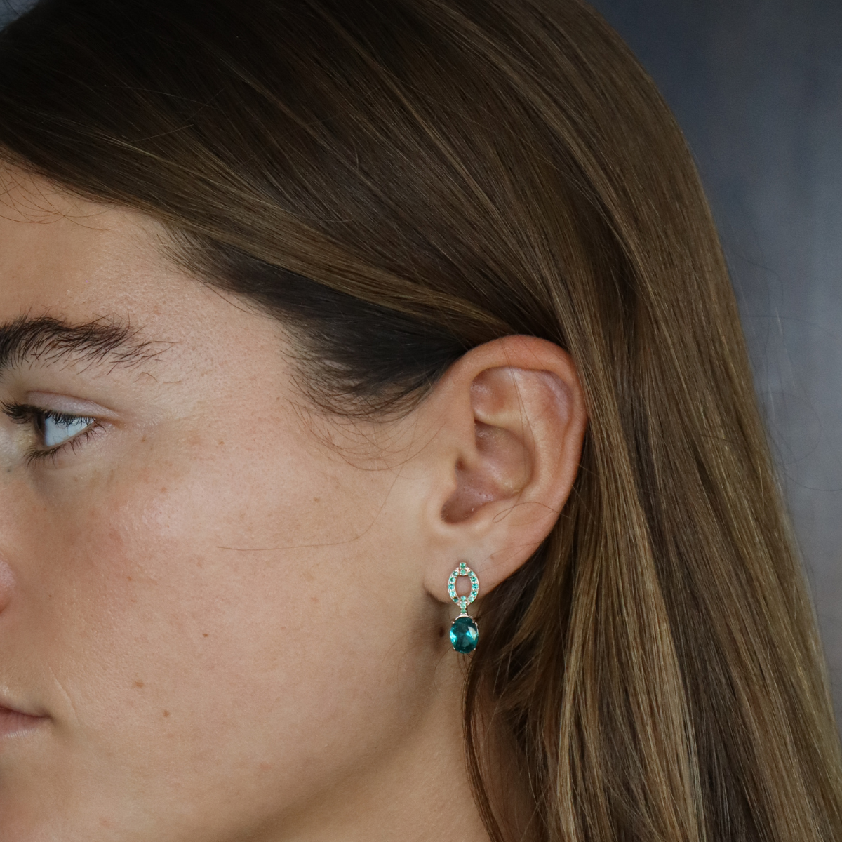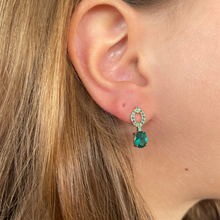 זוג עגילים אלגנטים מכסף אמיתי עם שיבוץ זרקונים ירוקים. מגיע גם בציפוי זהב צהוב/ רוז גולד.