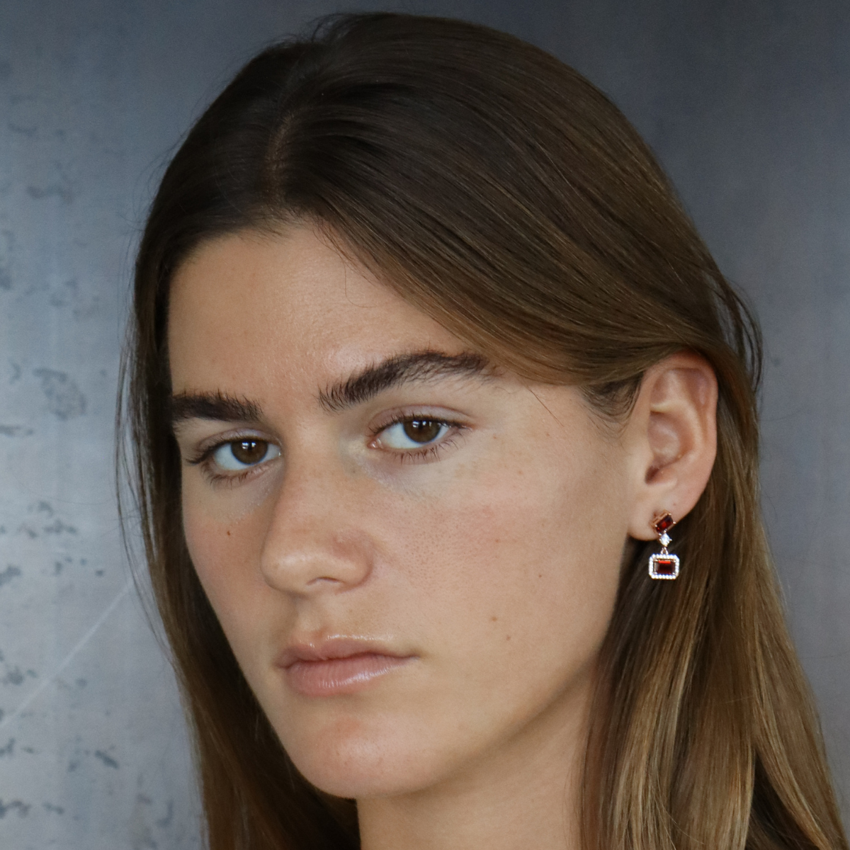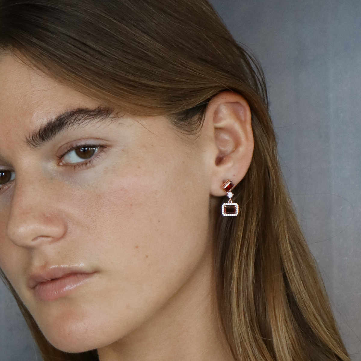 עגיל נופל מלבני אדום, מורכב משני חלקים, מלבן קטן אדום ומלבן נוסף אדום משובץ בזרקונים שקופים. עגיל עדין ורך מאוד נאים לכל אוירה, מראה קלאסי ורך, ומי שאוהבת מראה קצת יותר שובבי